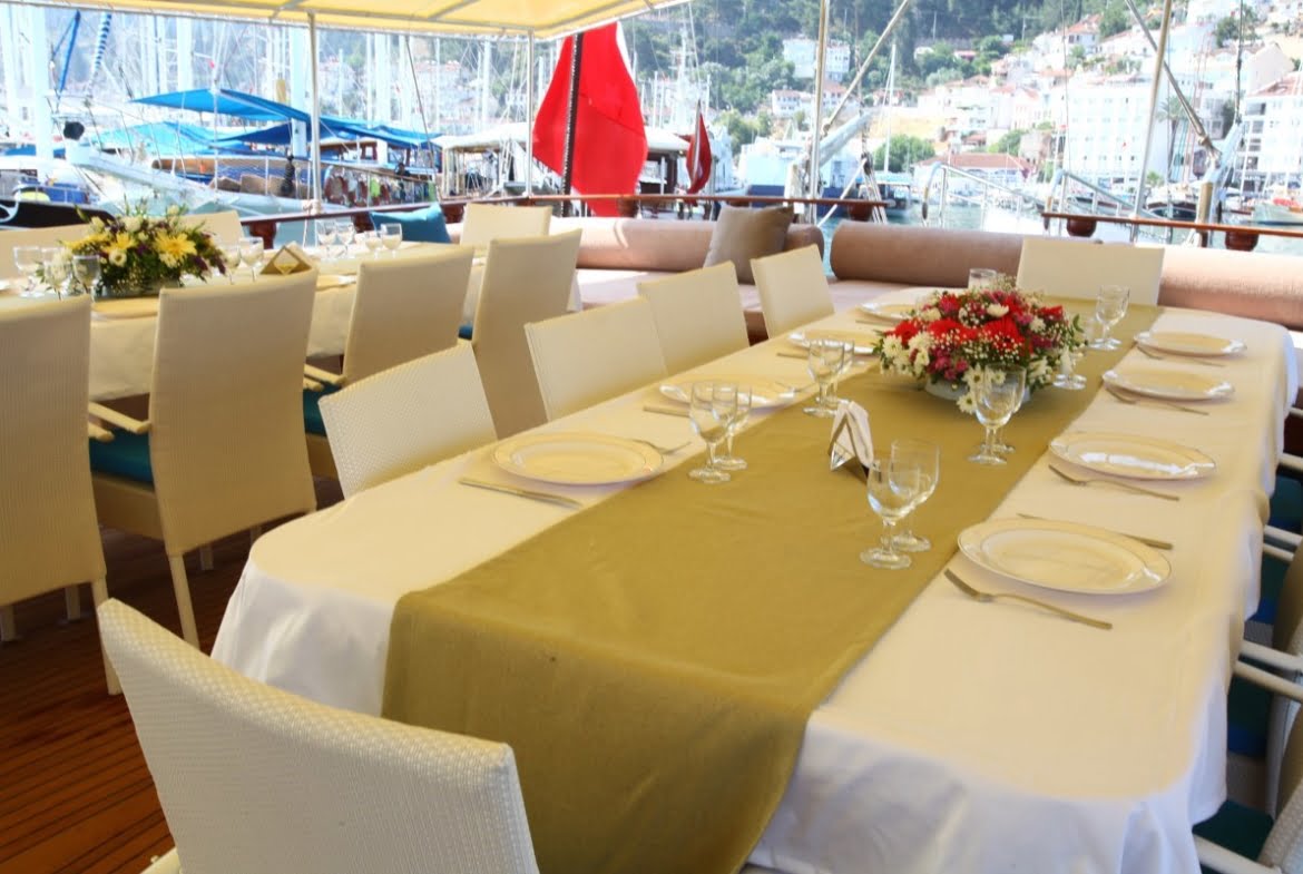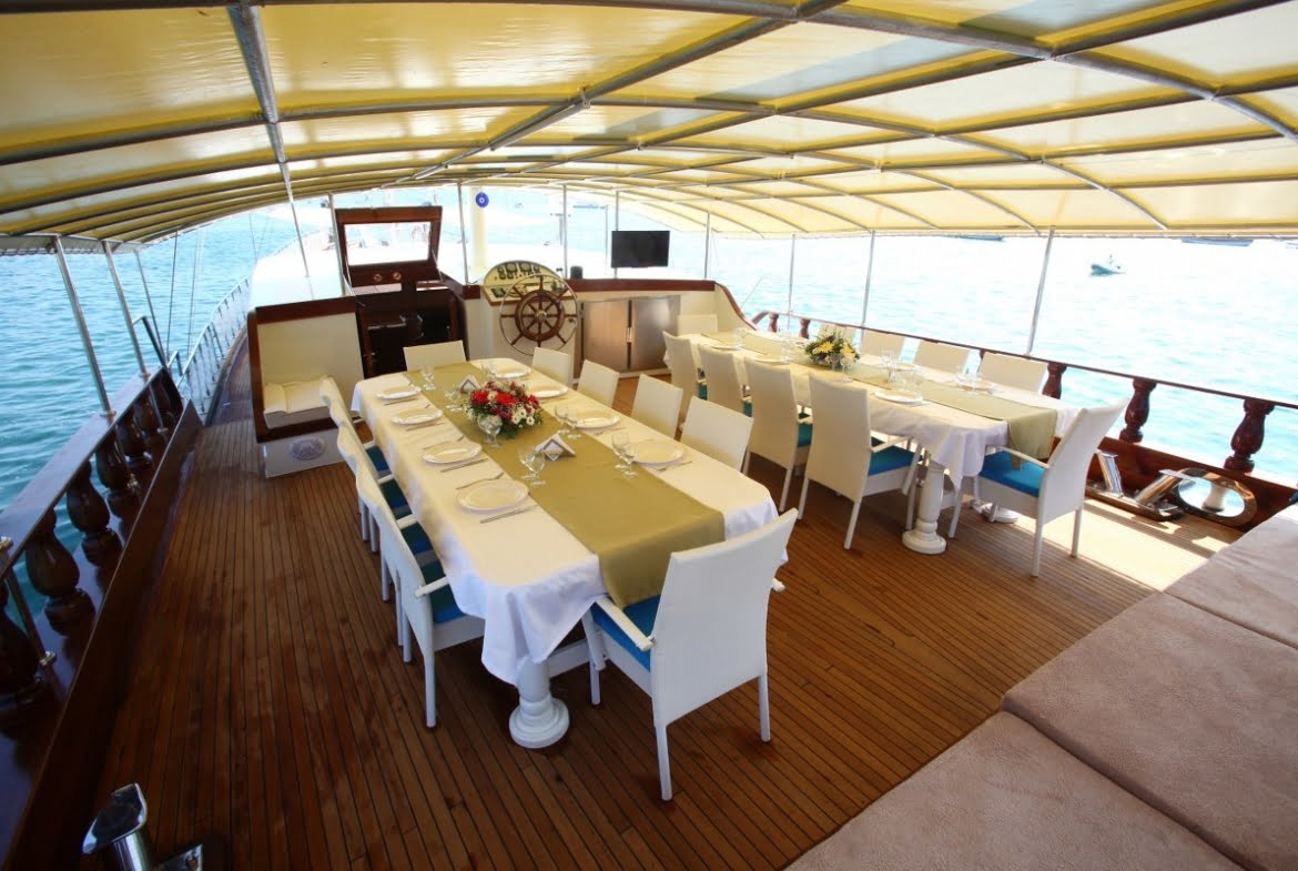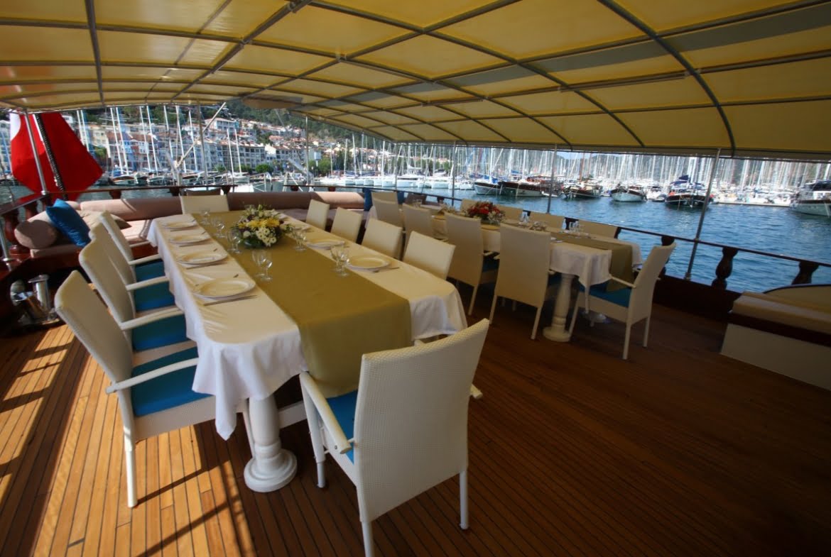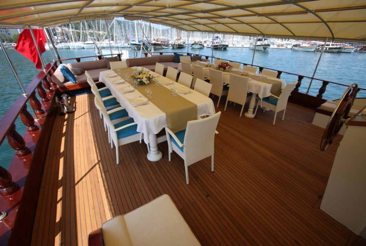 Holiday 5 Gulet has 10 cabins and a capacity up to 20 persons. She is especially designed for large groups. Holiday V Yacht.Holiday V has been completely refurbished in year 2015, she has 10 cabins and is comparing to other gullets in a reasonable price she is ideal for our guests that are planning a blue cruise. She is designed with a capacity to accommodate up to 20 persons in the most beautiful bays of the Mediterranean. On board you are accompanied with an experienced and friendly crew. Our gulet provides you a high class service in a reasonable price at the same time you can do cabin charters with her. Holiday V Yacht.